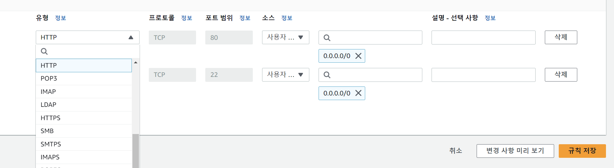 - ๋ณด์ ๊ทธ๋ฃน : ์ธ์คํด์ค์ ์ฐ๊ฒฐํ ์ ์๋ ํ๋กํ ์ฝ, ํฌํธ, ์์ค IP ๋ฒ์๋ฅผ ์ง์ ๊ฐ๋ฅ