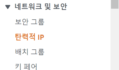 EC2 ๋์๋ณด๋ ์ผ์ชฝ ๋ฉ๋ด๋ฐ์์ ํ๋ ฅ์ IP๋ฅผ ์ฐพ์ ํด๋ฆญํ๊ณ ์์ฑํ๋ค.