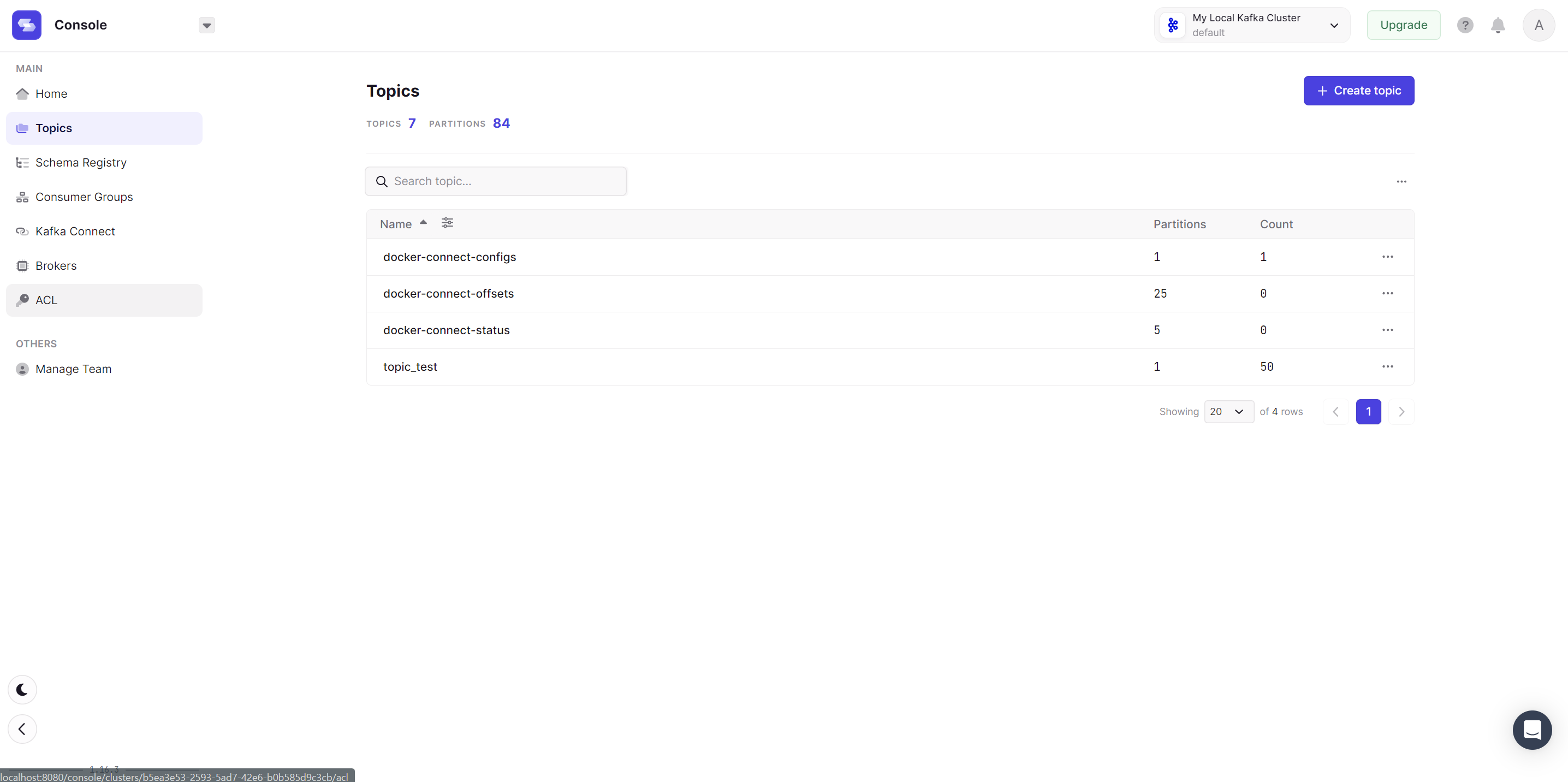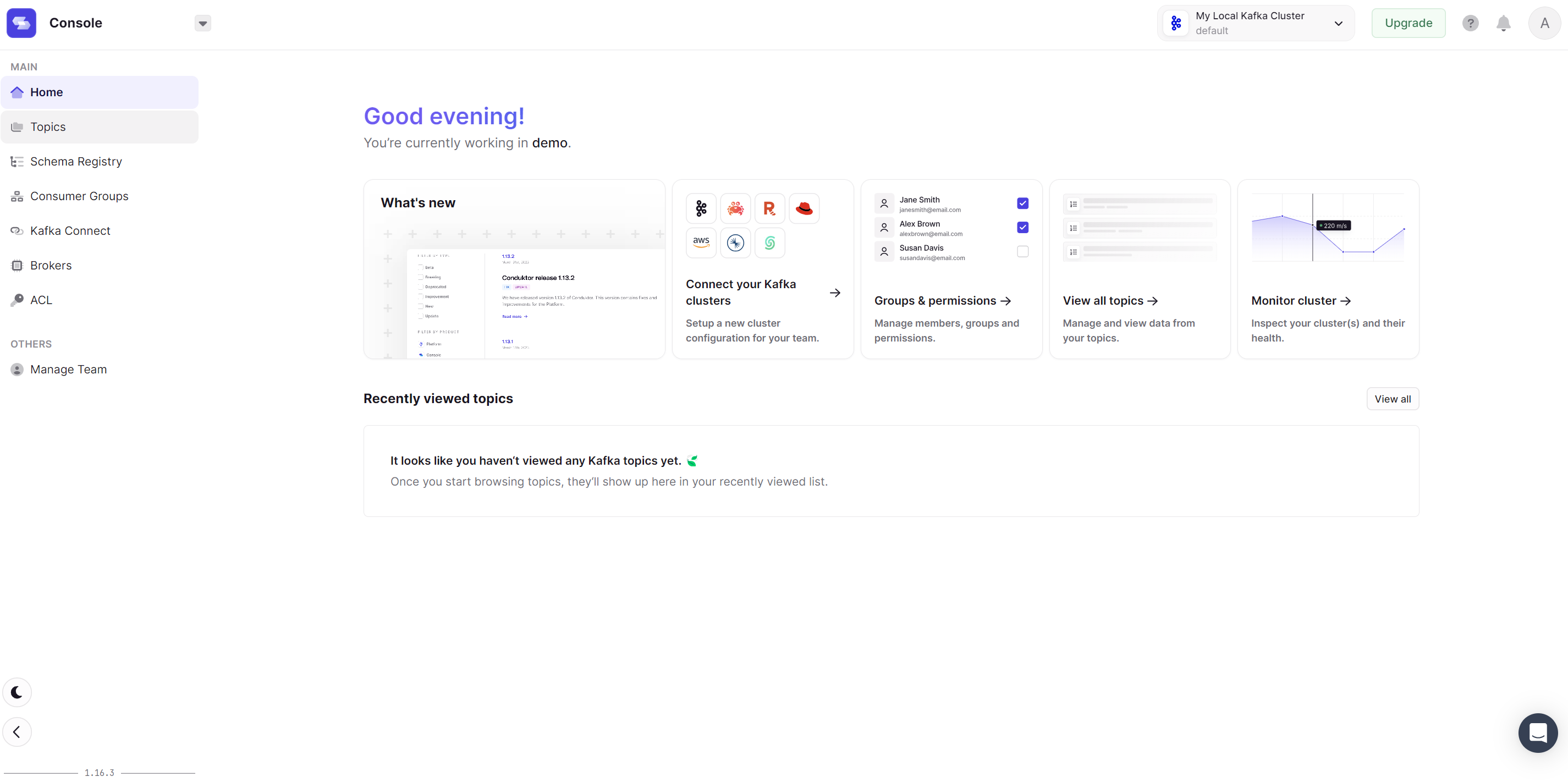 ์ผ์ชฝ ๋ฉ๋ด์ ๋ณด์ด๋ Topics, Schema Registry, Consumer Groups ๋ฑ ์ด์ ๊ป ์์๋ดค๋ ๊ธฐ๋ฅ๋ค์ ์ฝ๊ฒ ํ์ธํ ์ ์๋ค.